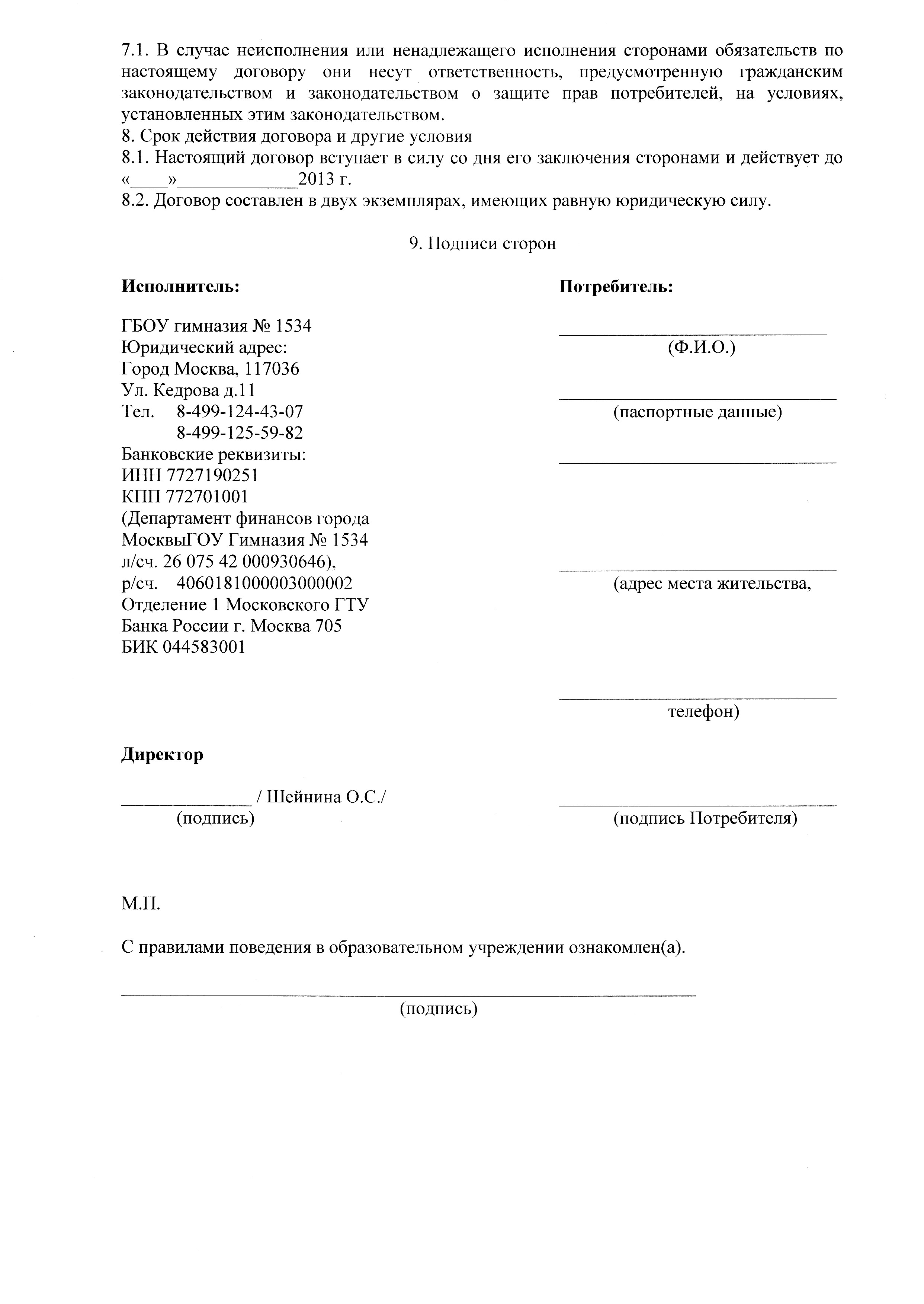 4) настоятельно рекомендую тем, кто решил временно пропустить месяц занятий, пропустил месяц занятий по уважительной причине (по болезни со справкой) или решил бросить занятия обратиться к Инсаровой Т.В. сразу же после каникул для выяснения вопроса об оплате пропущенных месяцев или для оформления расторжения договора! По договору, который Вы заключали с администрацией, Вы обязаны оплатить обучение за все месяцы до расторжения договора, кроме случаев, когда вы пропустили занятия по причине длительной болезни. Я со своей стороны могу предложить только дополнительные занятия, Вам могу посоветовать в следующий раз внимательнее читать договоры.